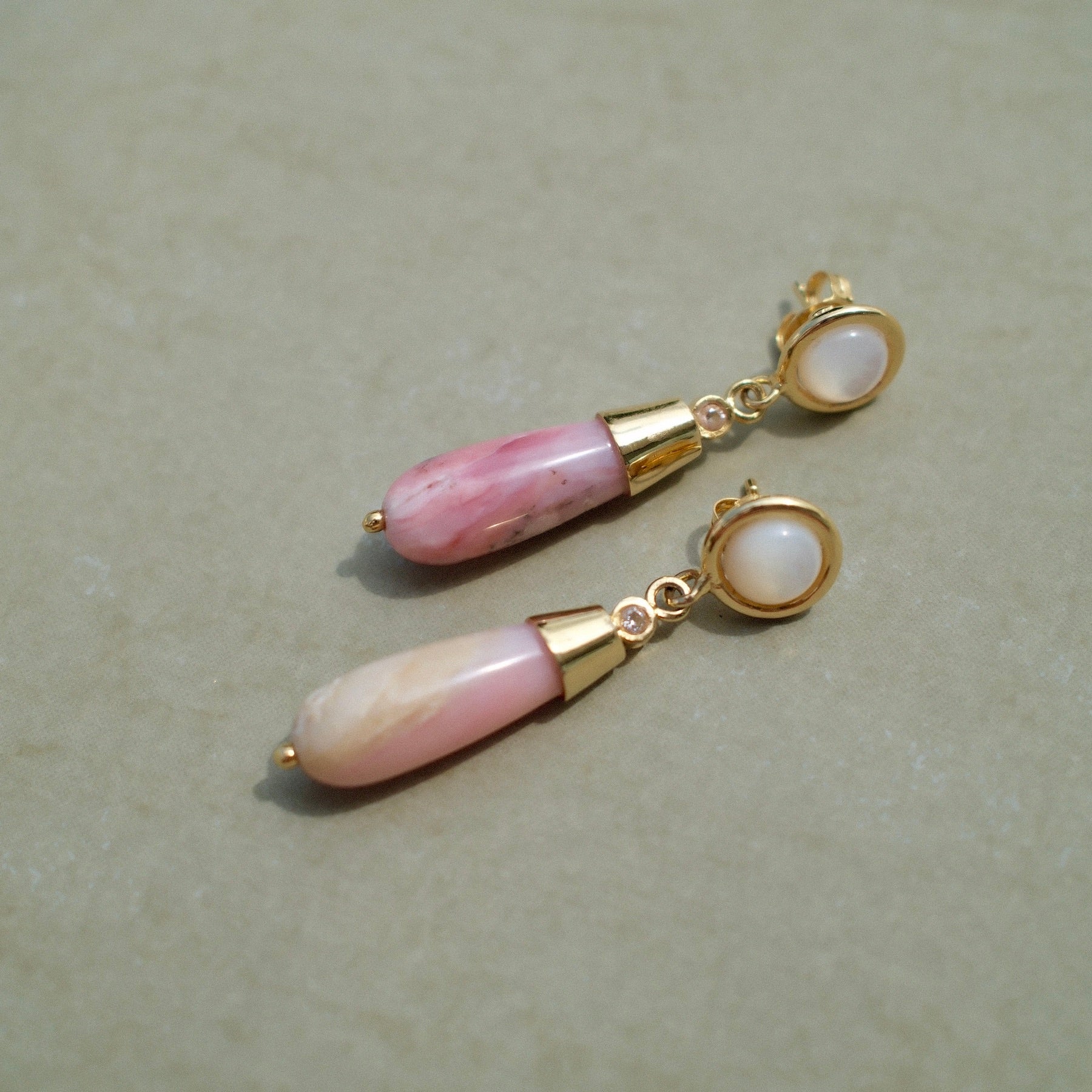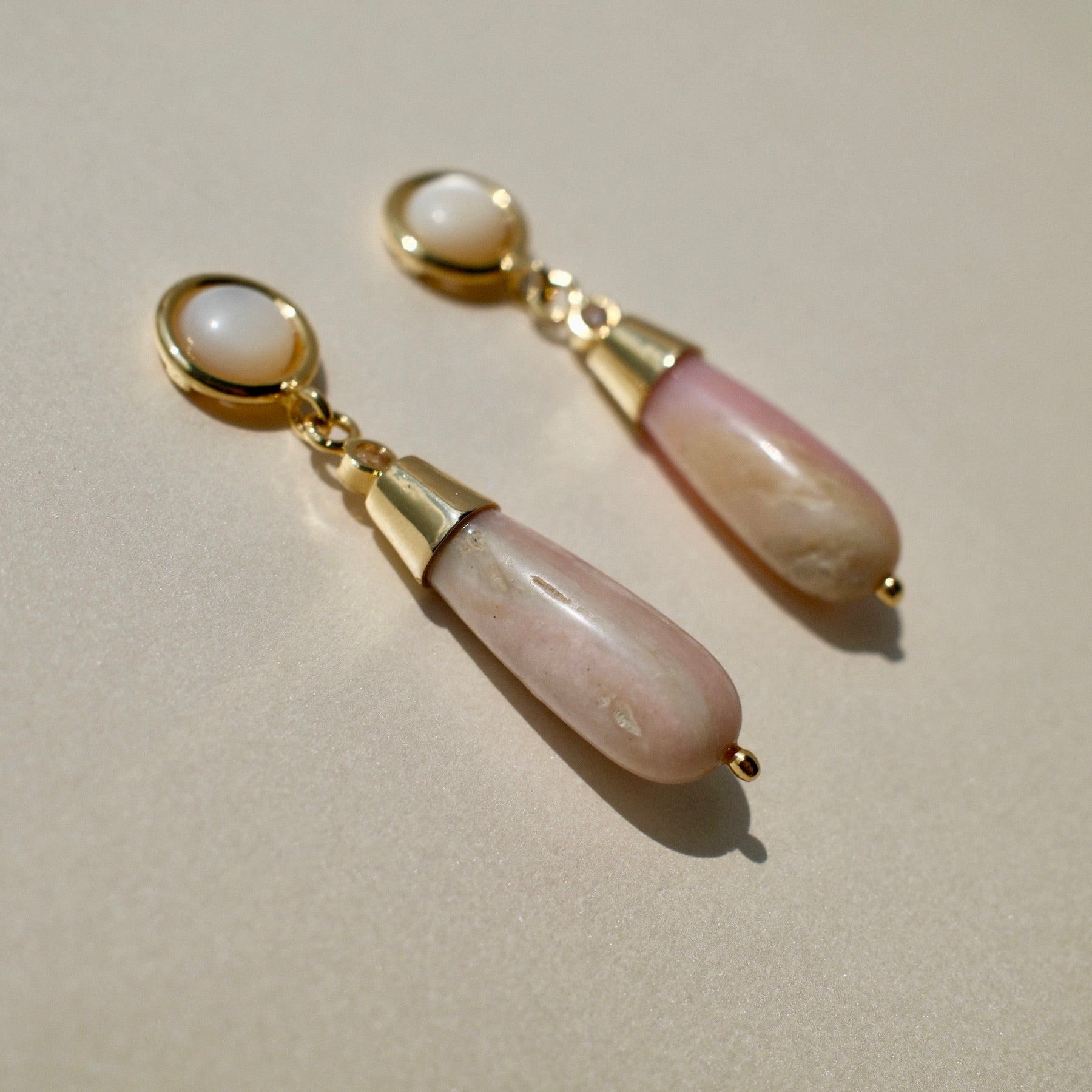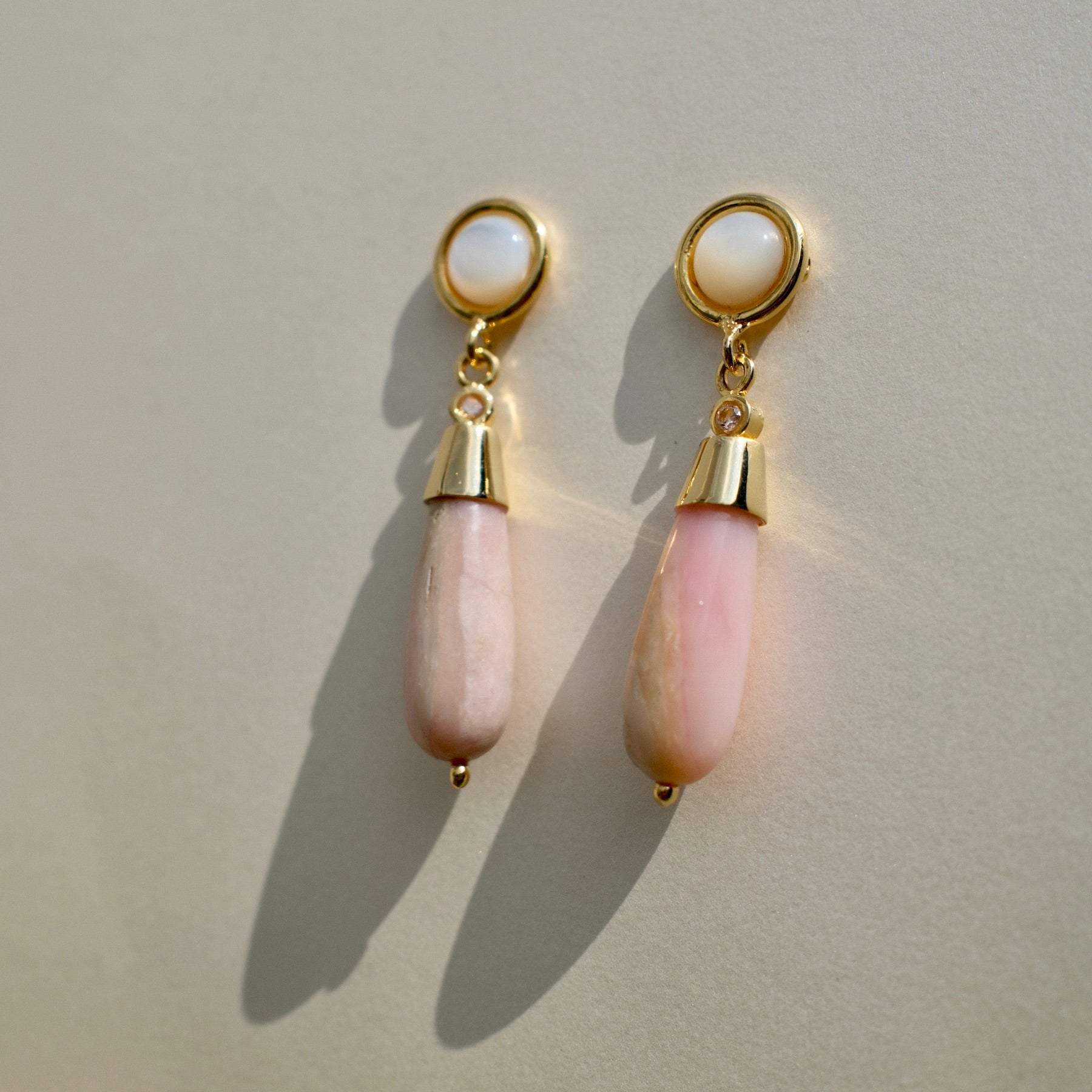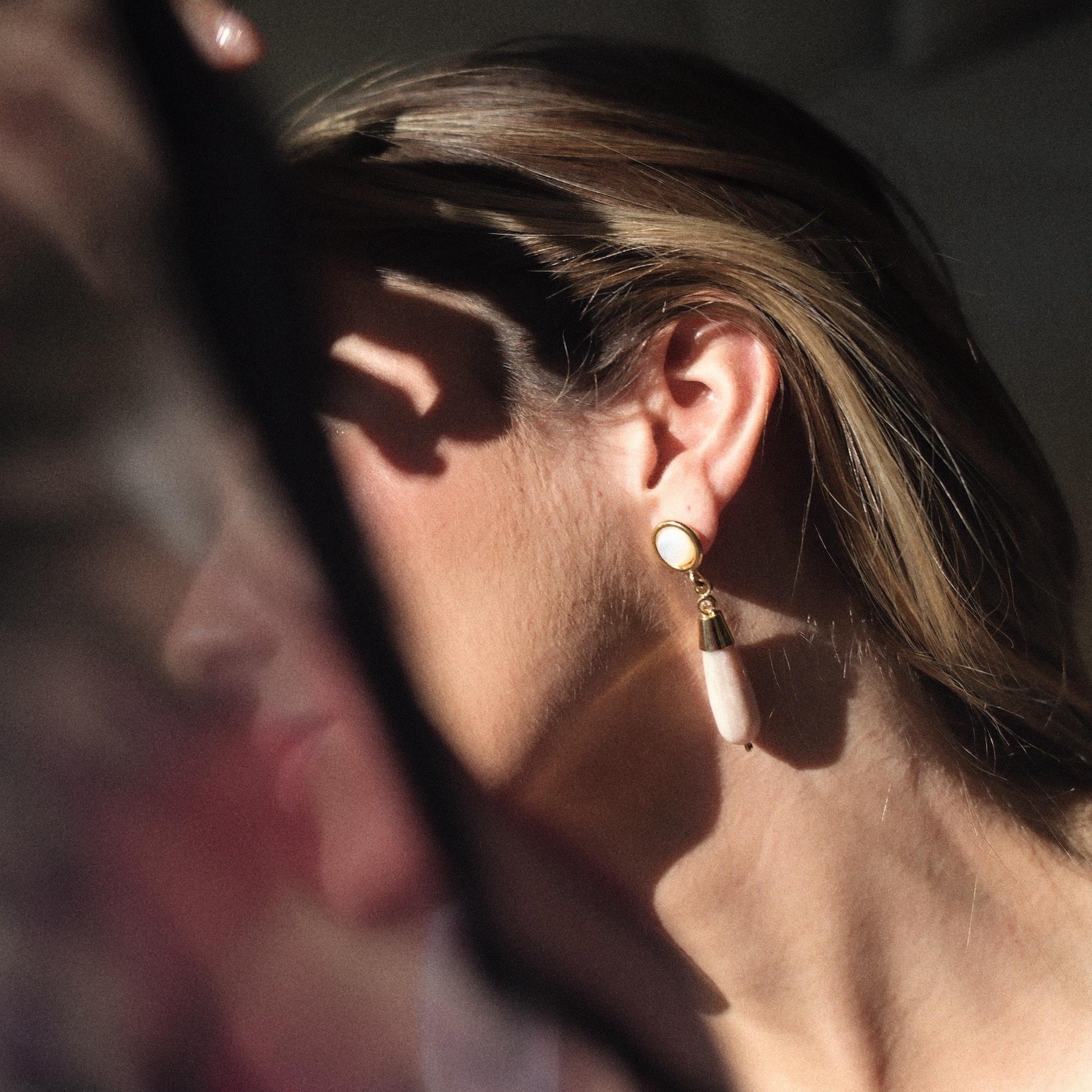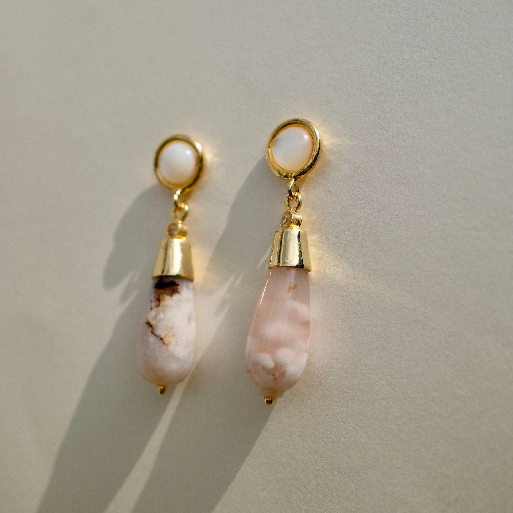 Una pieza que se asemeja a una poesía. Combina nácar con ágatas rosas y blancas. Una pieza que se destaca, tiene movimiento, el color dorado brinda calidez y la composición total tiene un toque vintage.