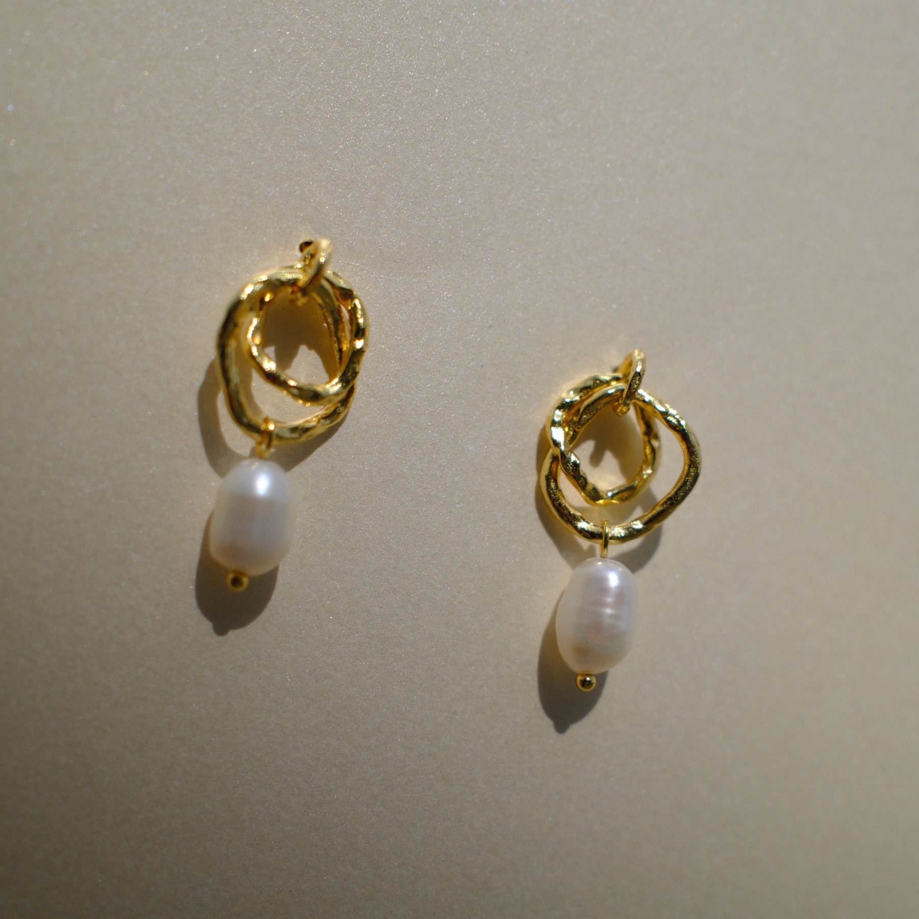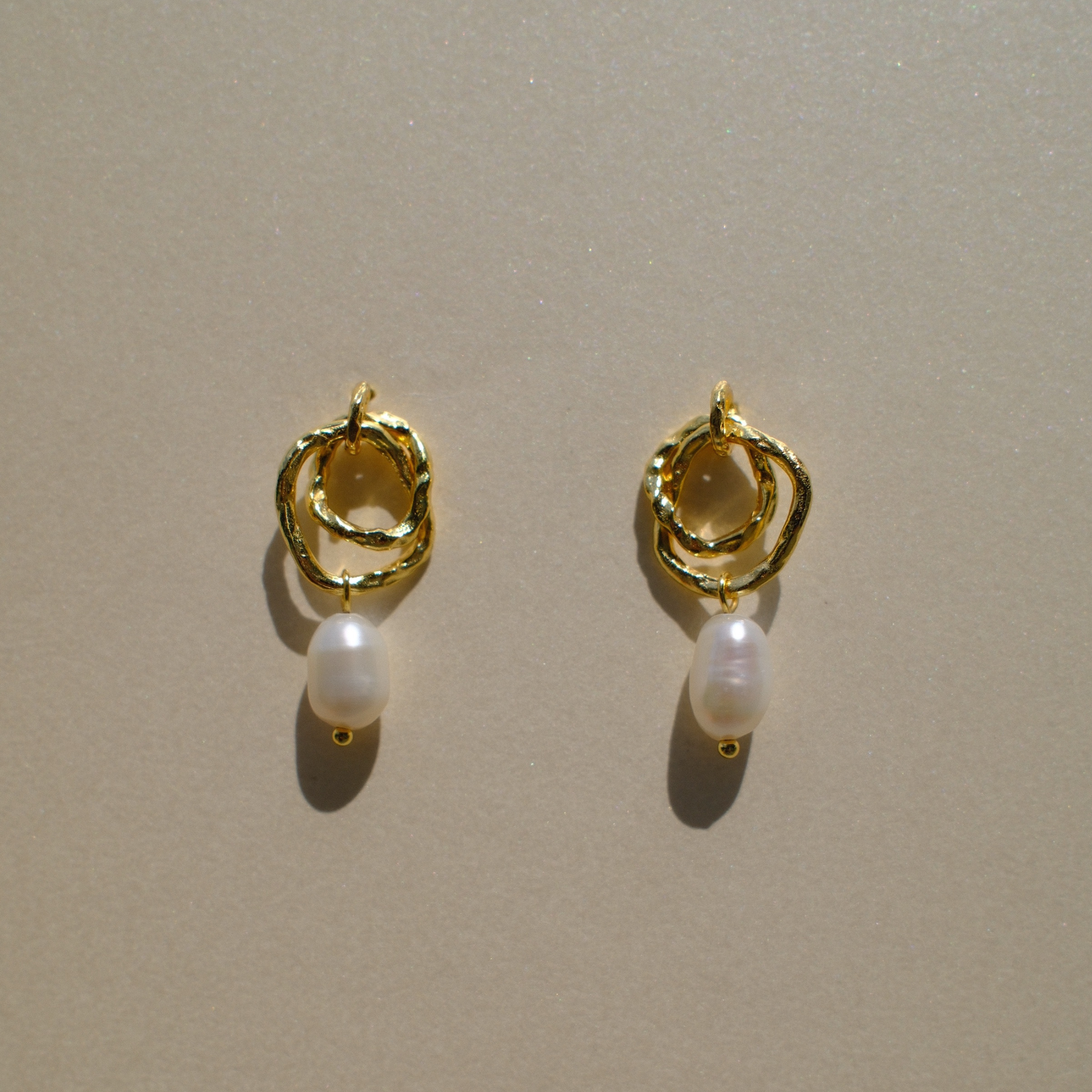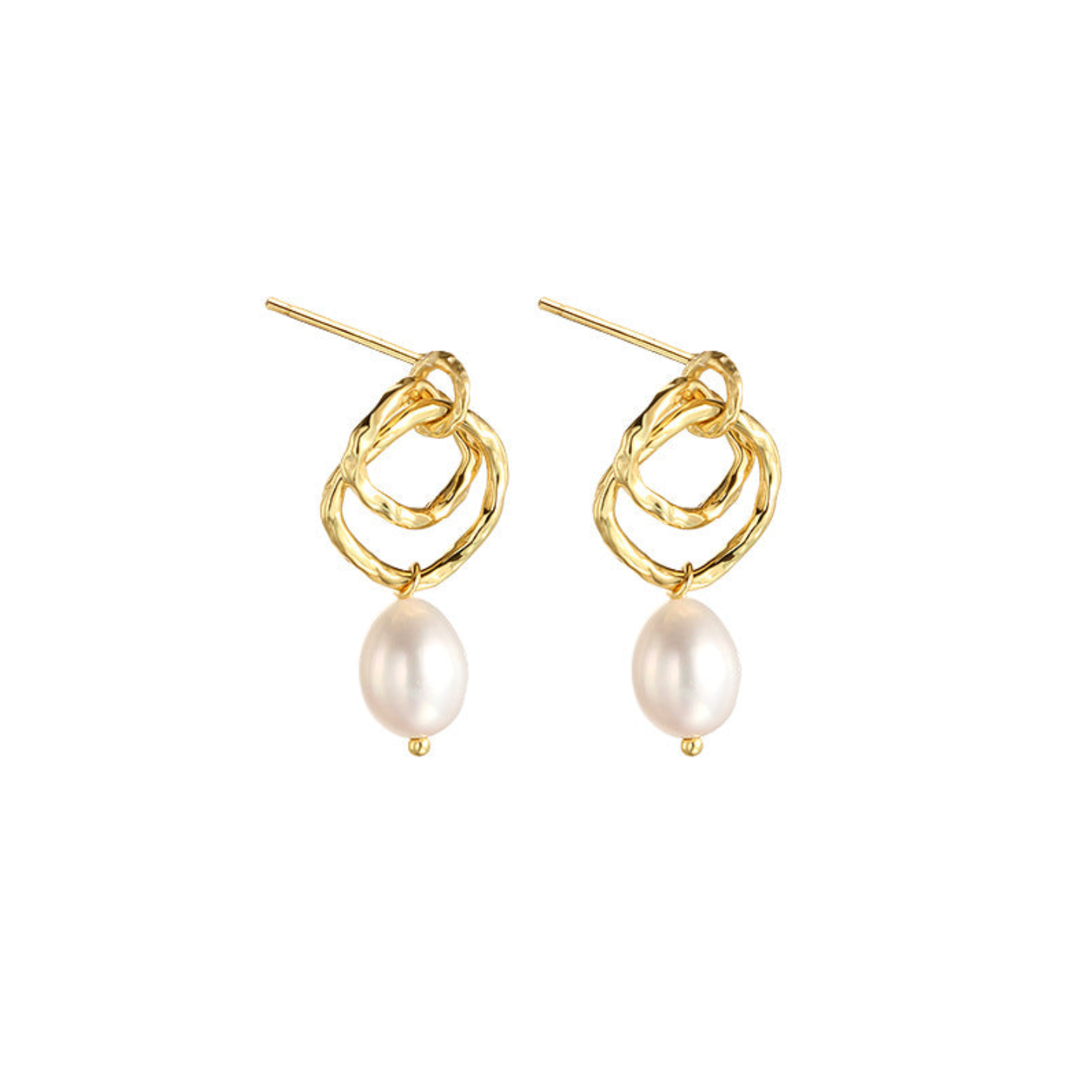 Los aretes Hali presentan un diseño elegante y moderno. Están compuestos por dos aros irregulares en tono dorado, con una textura ondulada que les da un acabado orgánico y artesanal. De cada aro cuelga una perla blanca en forma de gota, aportando un toque clásico y delicado que contrasta con la forma libre de los aros metálicos.