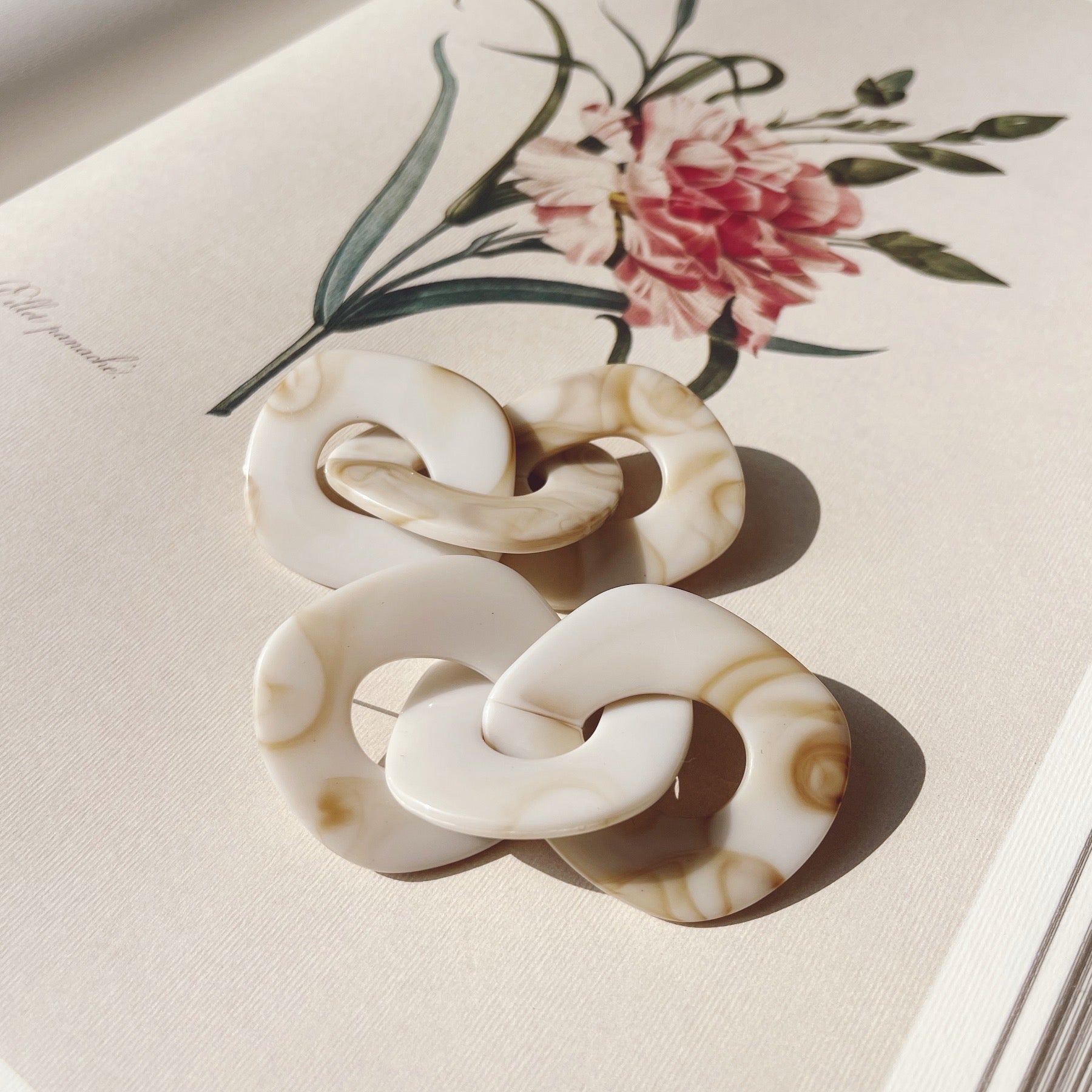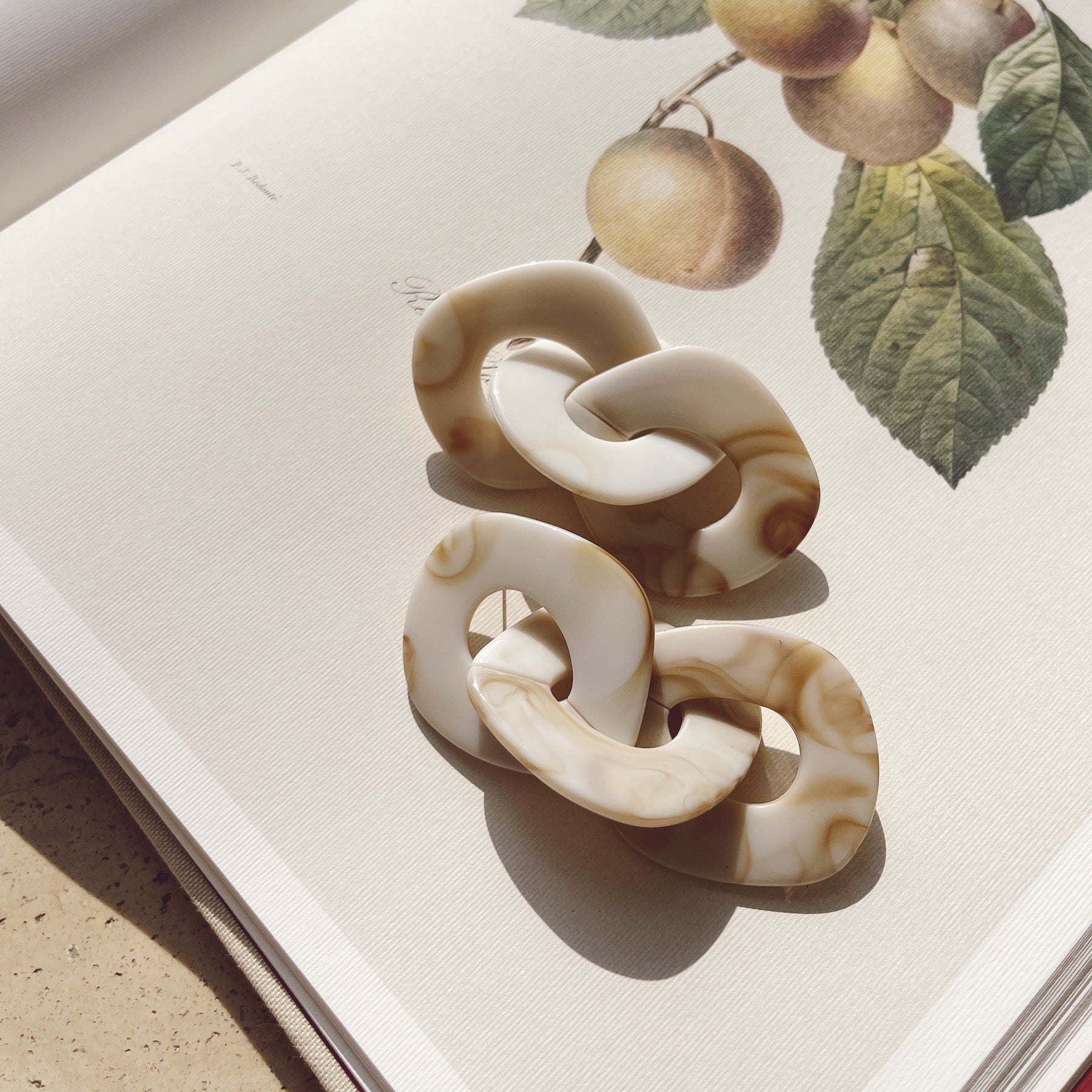 Nuestros aretes en acrílico blanco con vetas café son una propuesta absolutamente moderna con sus figuras geométricas. Su tamaño hace que llamen mucho la atención y sus tonos les da ese aspecto elegante que caracteriza la marca.