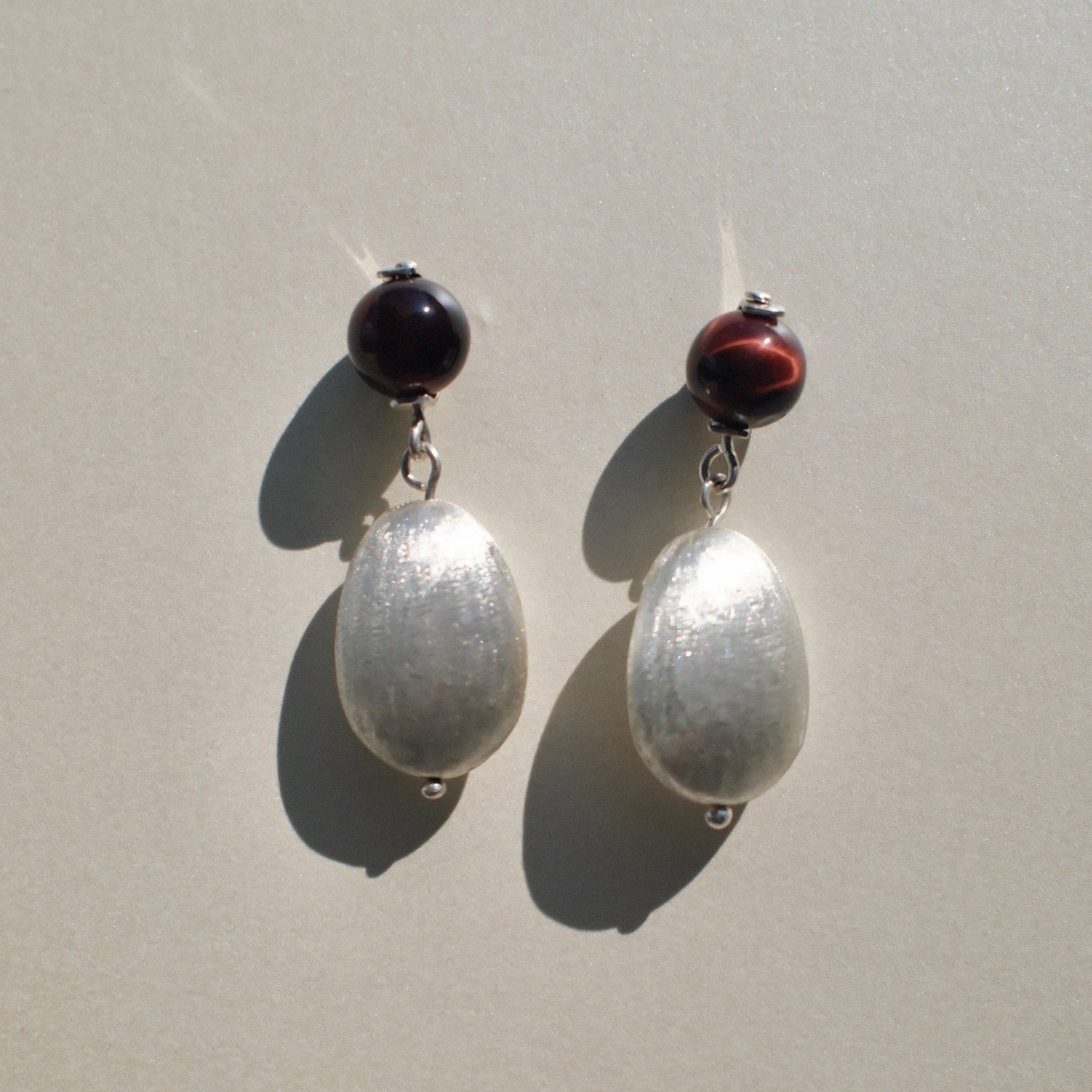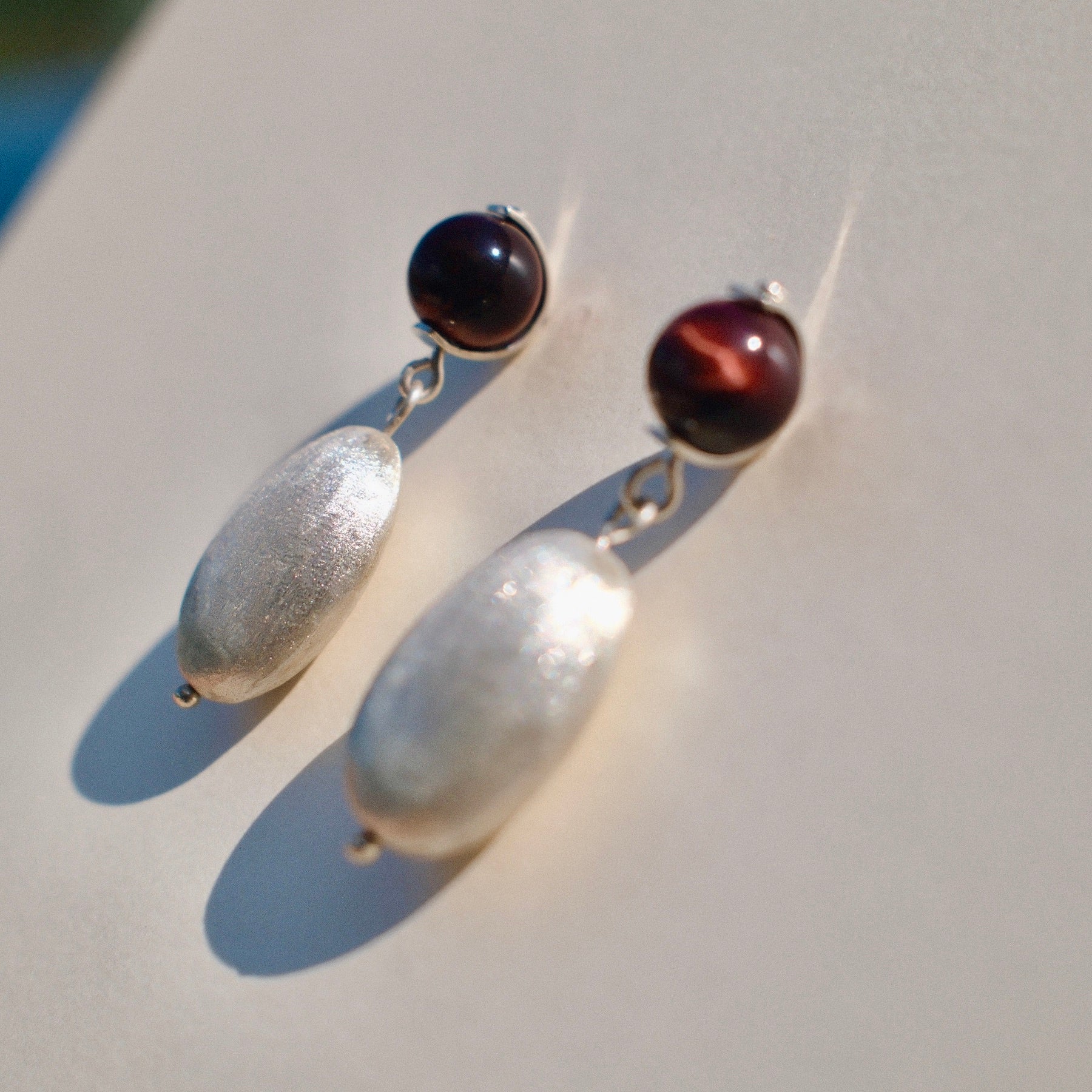 Los aretes Kai combinan la magia de las piedras naturales con el brillo inconfundible de la plata trabajada a mano. En la parte superior, puedes elegir entre piedra luna, perla, aguamarina, ojo de tigre o ágata verde, cada una con su energía y tono característico.