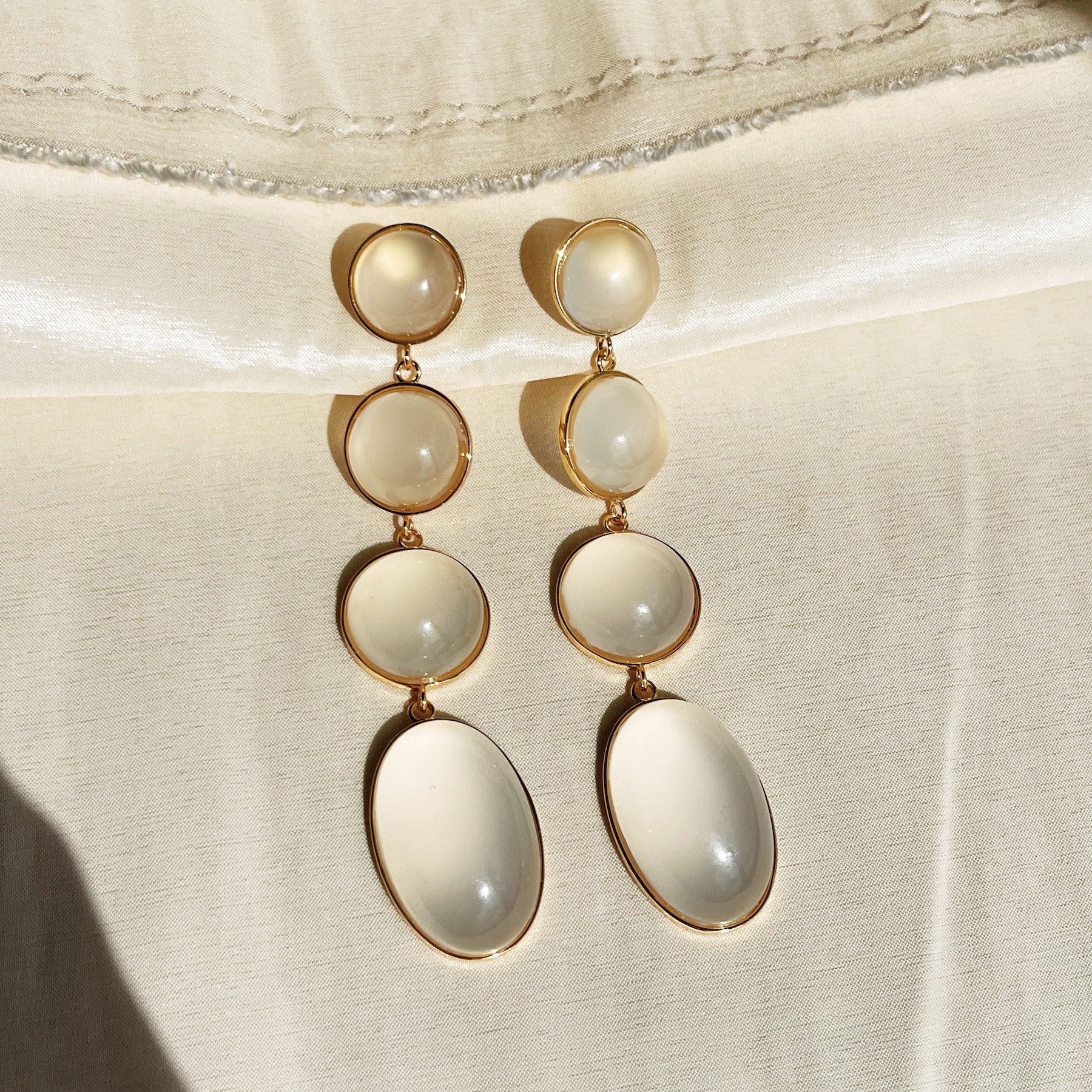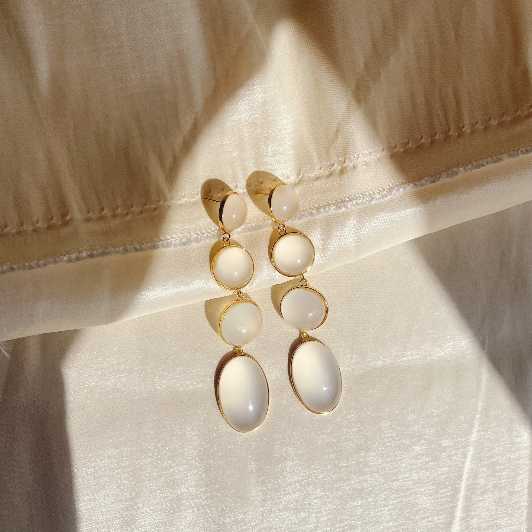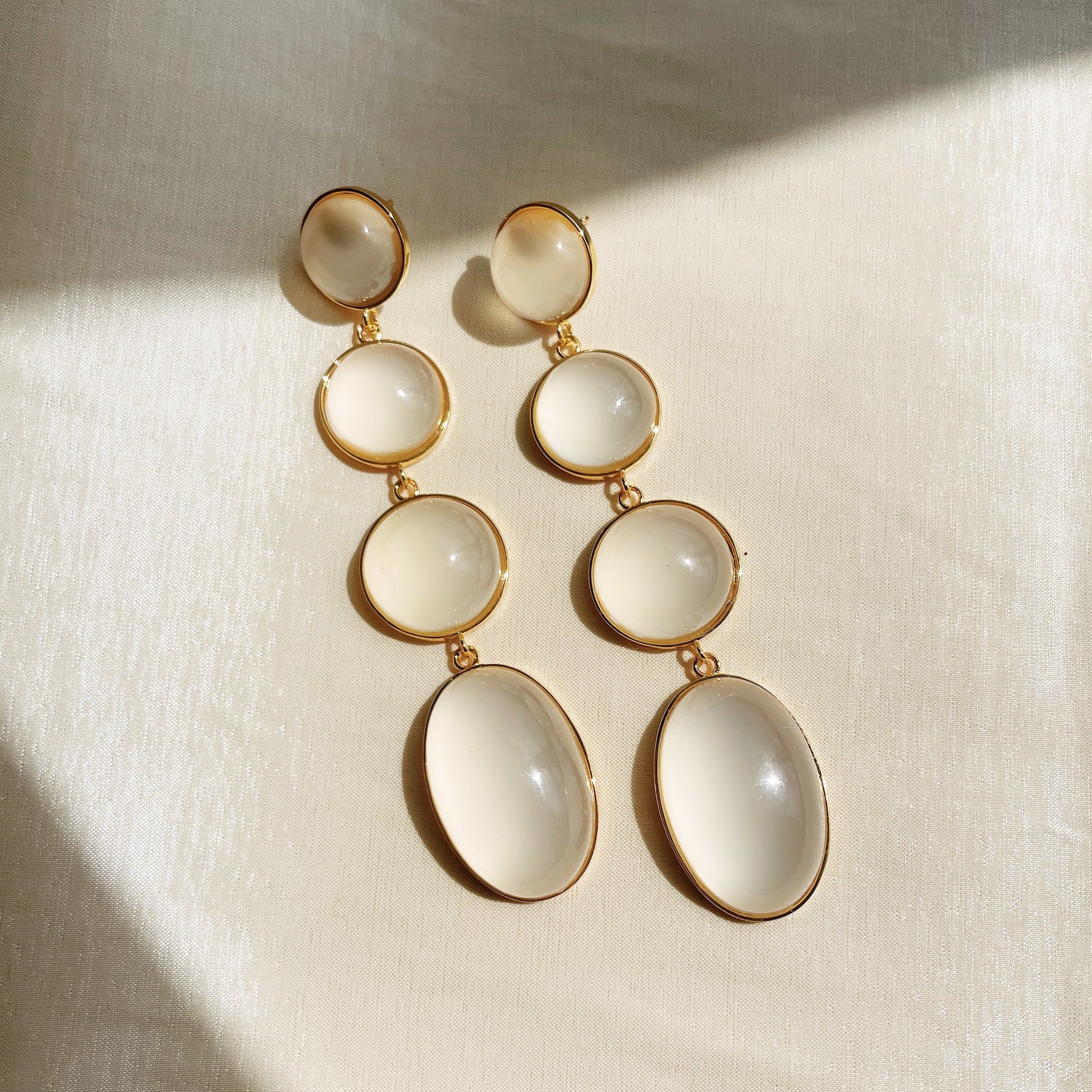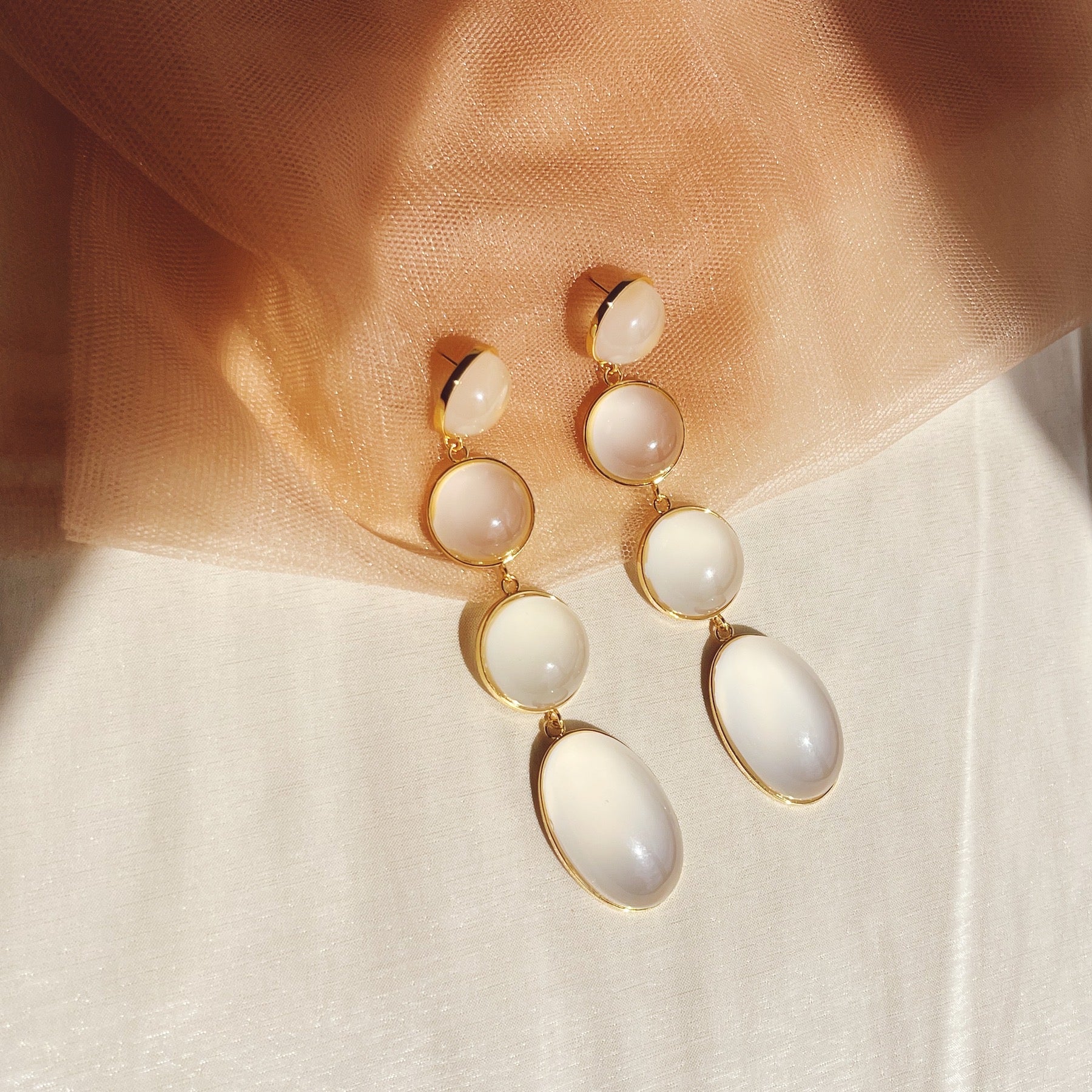 Estos aretes largos en caída cuentan con gotas de acrílico blanco con un elegante borde dorado. Su diseño ligero y fluido permite que se muevan con cada gesto, creando un juego de luces que resalta su belleza. Aunque son largos, su ligereza asegura comodidad, mientras que su silueta moderna y sofisticada aporta un toque de impacto y elegancia. Perfectos para ocasiones donde quieras destacar sin perder la gracia.