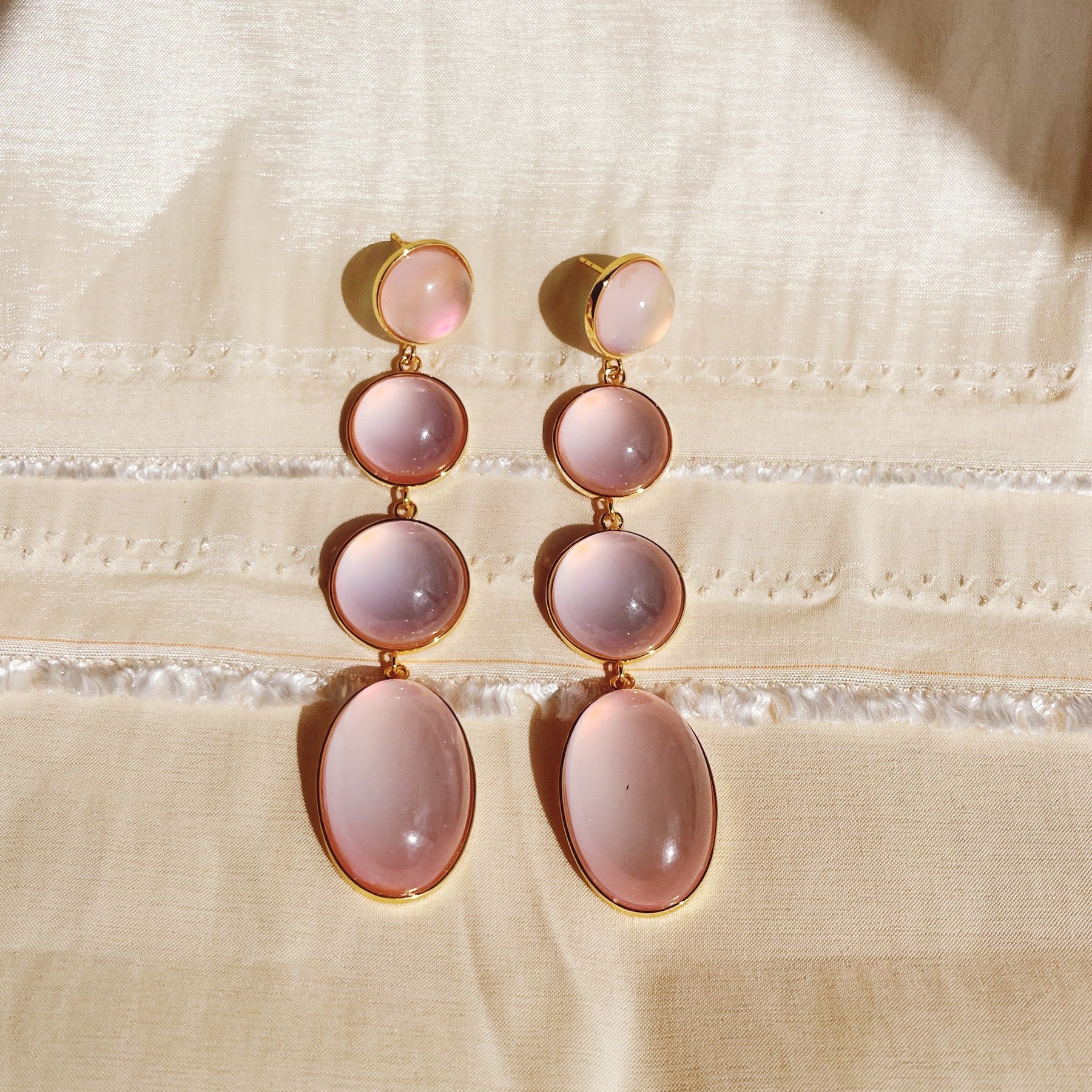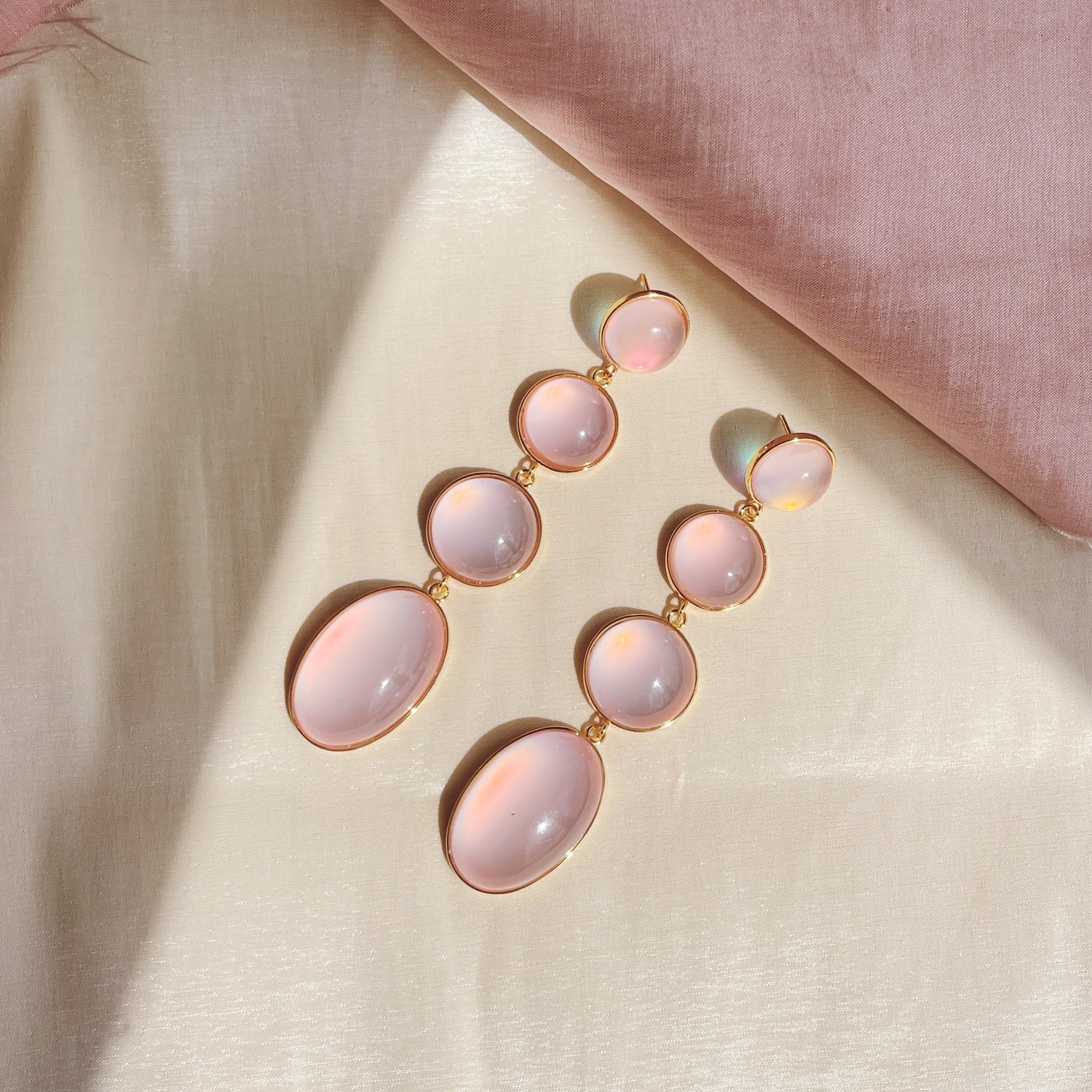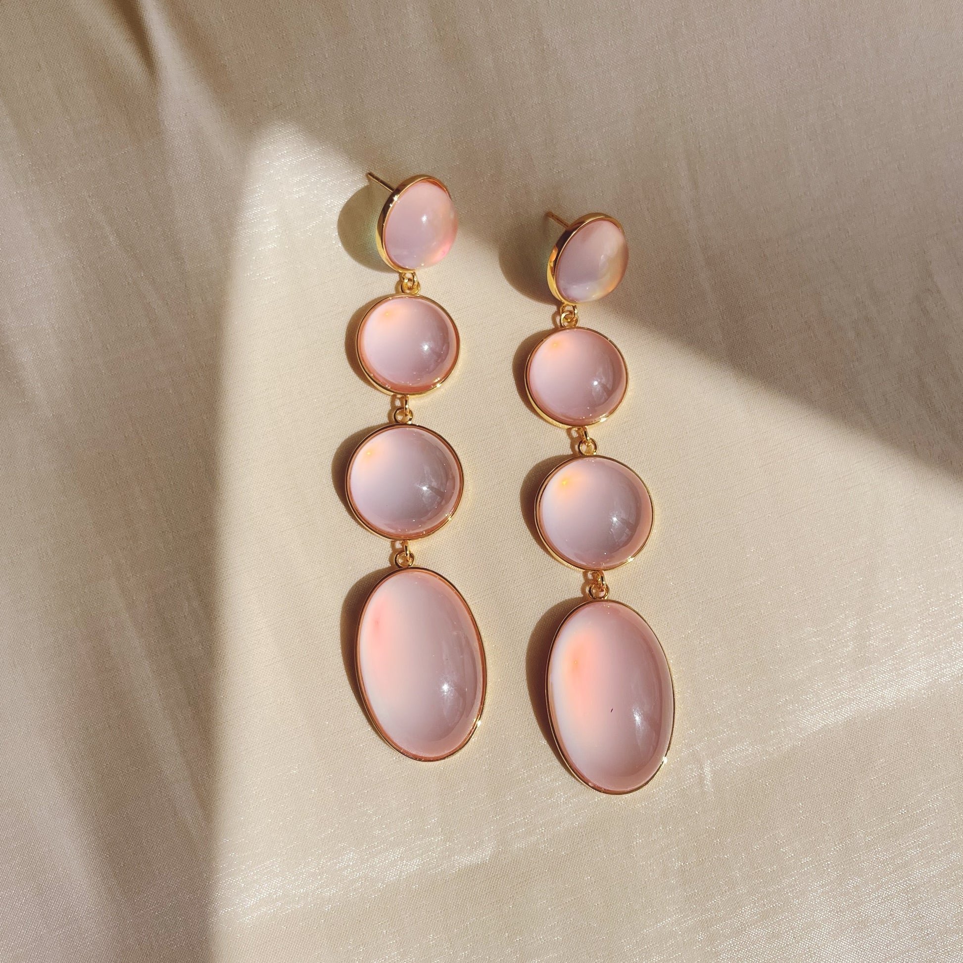 Estos aretes largos en caída cuentan con gotas de acrílico rosa con un elegante borde dorado. Su diseño ligero y fluido permite que se muevan con cada gesto, creando un juego de luces que resalta su belleza. Aunque son largos, su ligereza asegura comodidad, mientras que su silueta moderna y sofisticada aporta un toque de impacto y elegancia. Perfectos para ocasiones donde quieras destacar sin perder la gracia.
