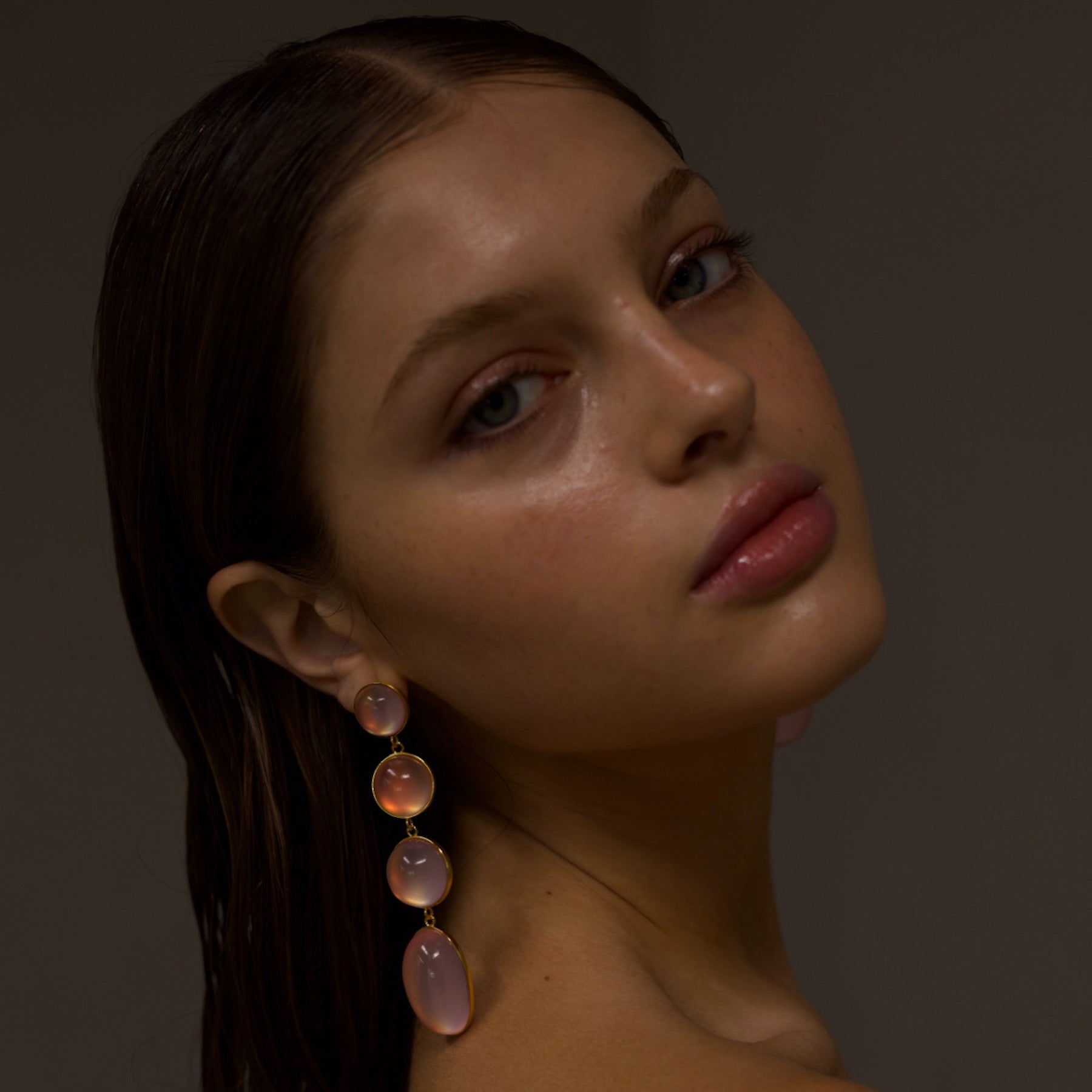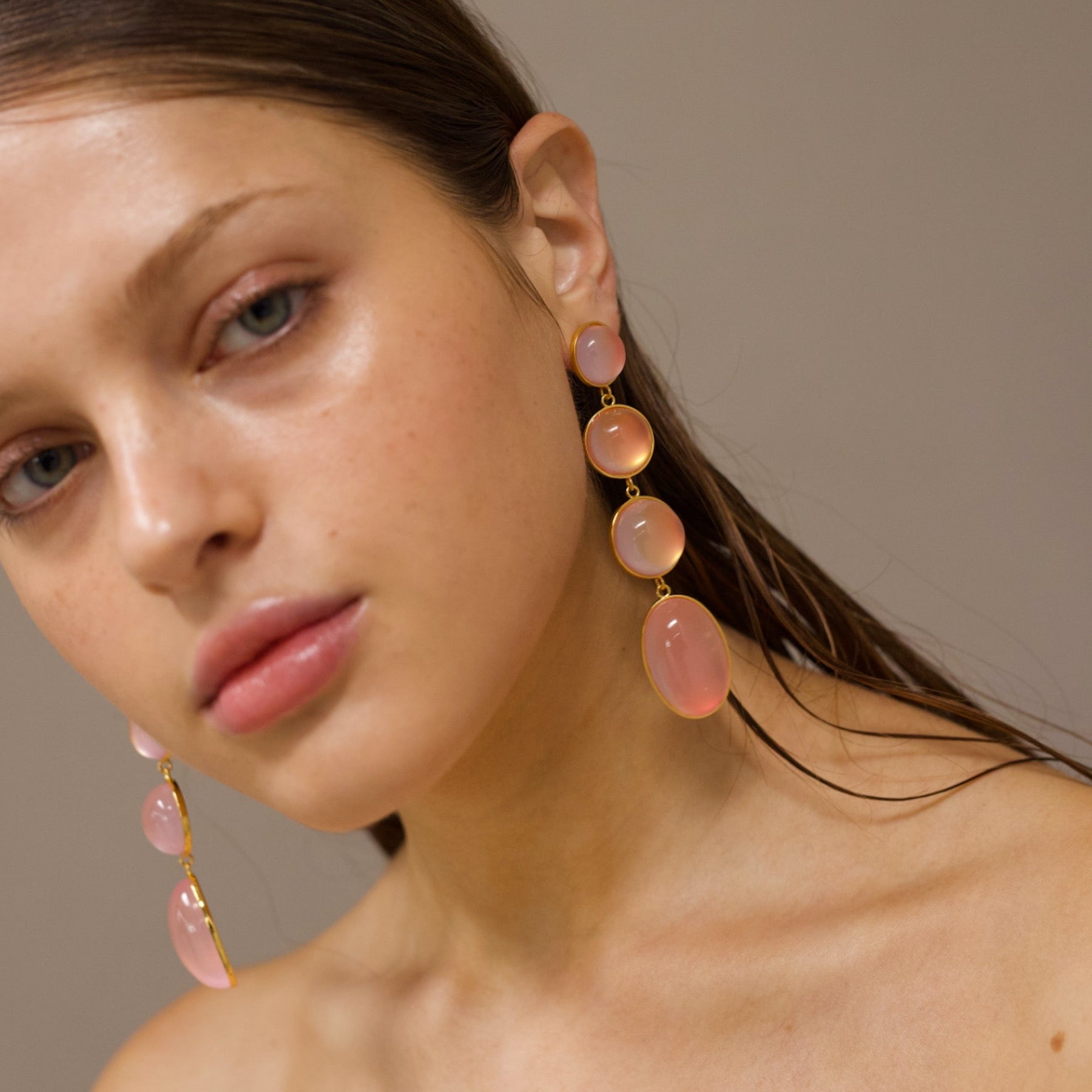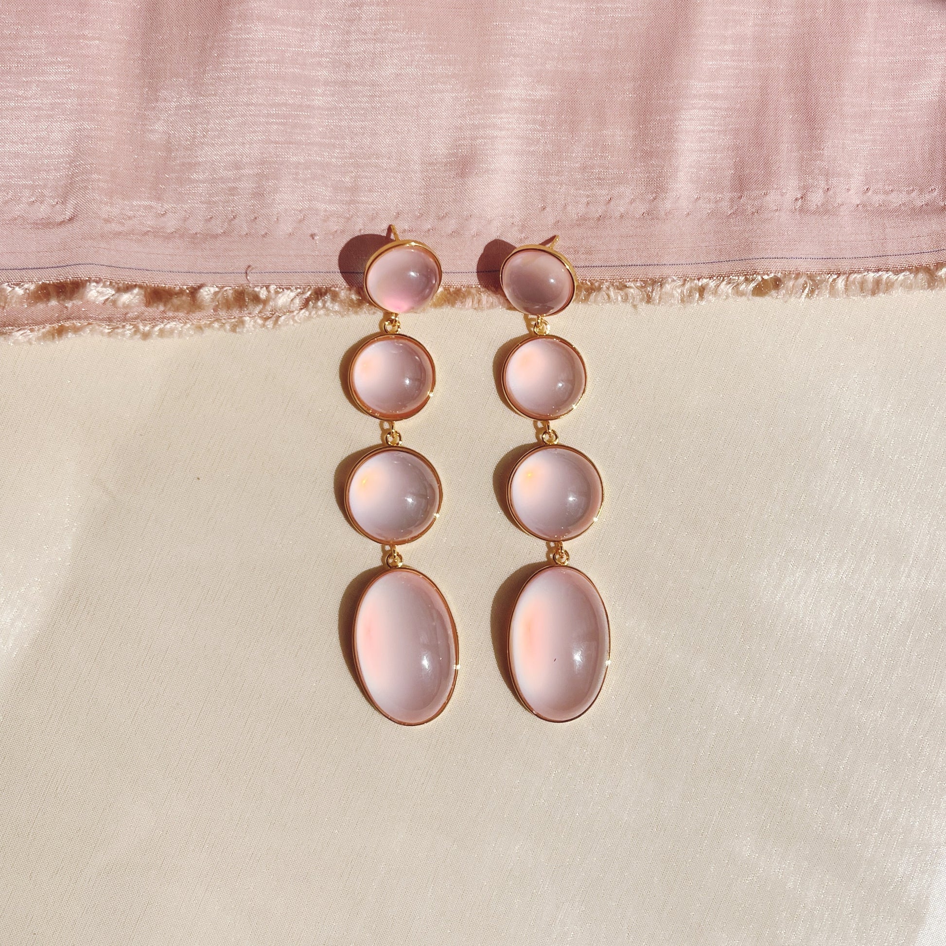 Estos aretes largos en caída cuentan con gotas de acrílico rosa con un elegante borde dorado. Su diseño ligero y fluido permite que se muevan con cada gesto, creando un juego de luces que resalta su belleza. Aunque son largos, su ligereza asegura comodidad, mientras que su silueta moderna y sofisticada aporta un toque de impacto y elegancia. Perfectos para ocasiones donde quieras destacar sin perder la gracia.