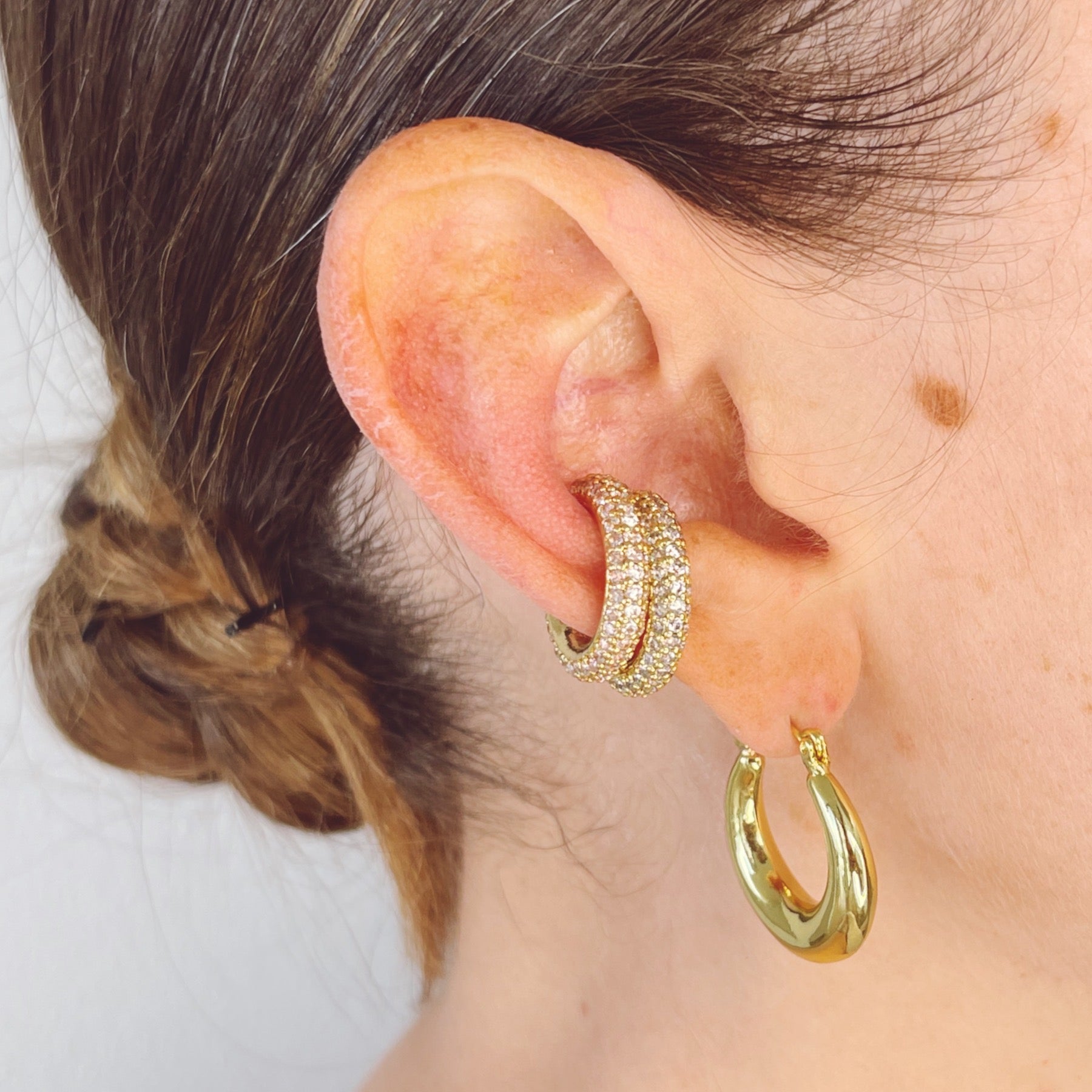 El earcuff perfecto para agregar elegancia y un poco de dramatismo. Los circones agregan ese brillo que elevan cualquier look.