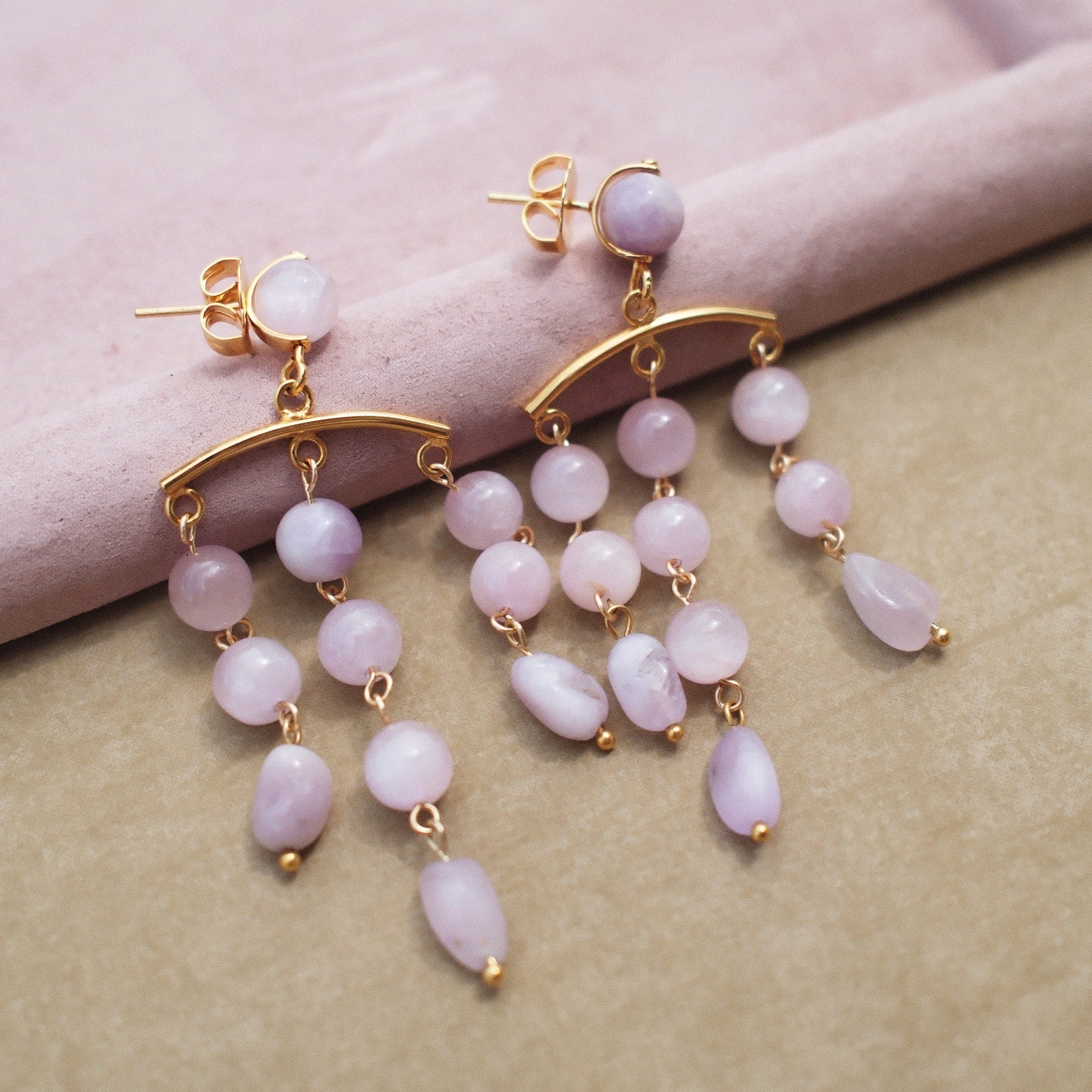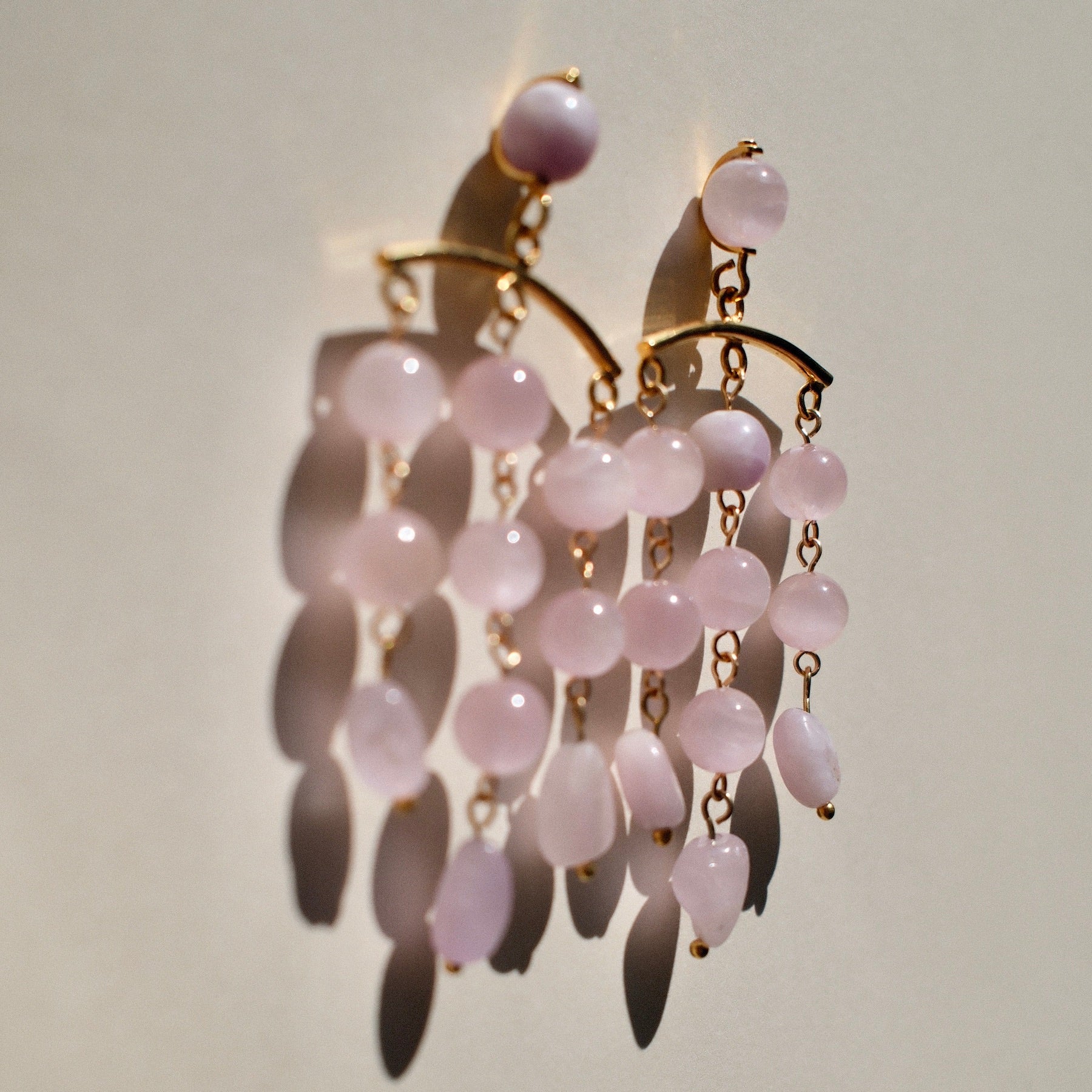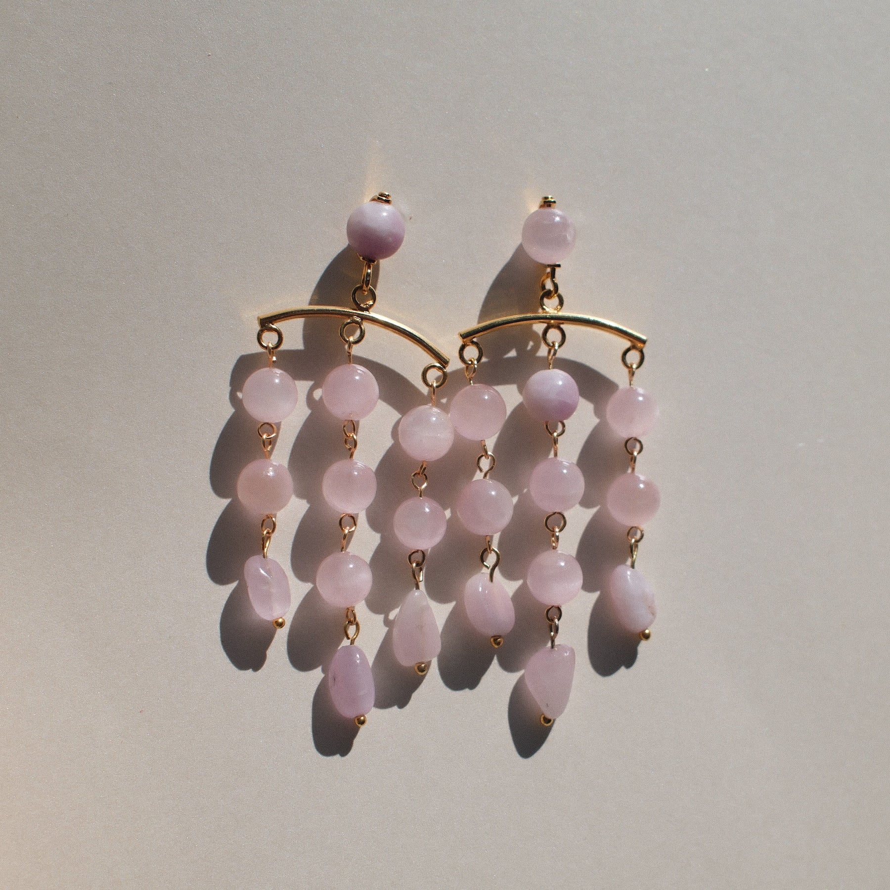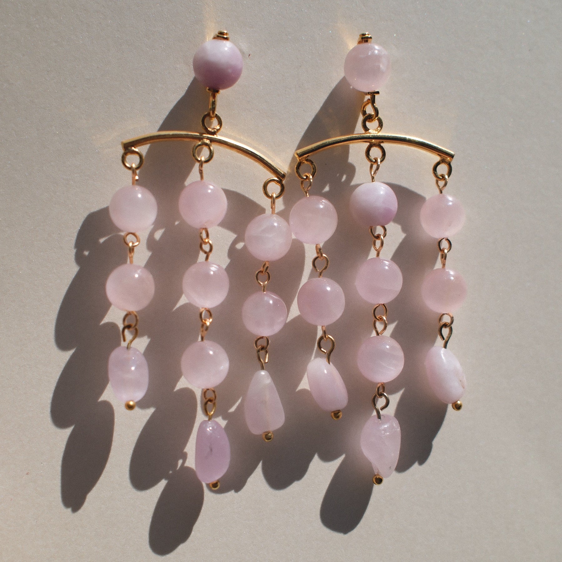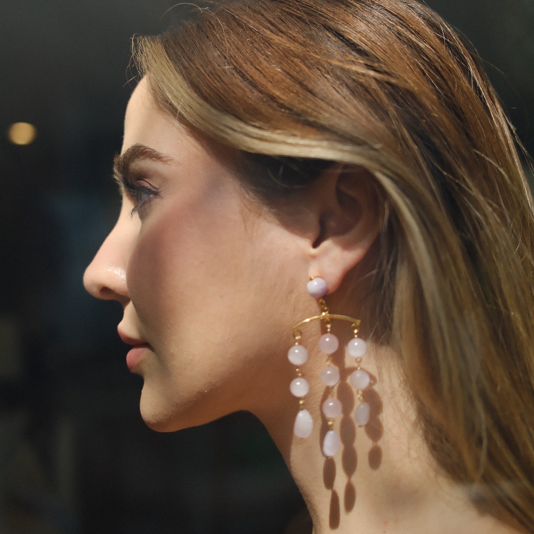 Esta joya se destaca por su color y movimiento. Aretes largos pero con much fluidez, ligeros y y con piedras naturales que juegan con la luz.