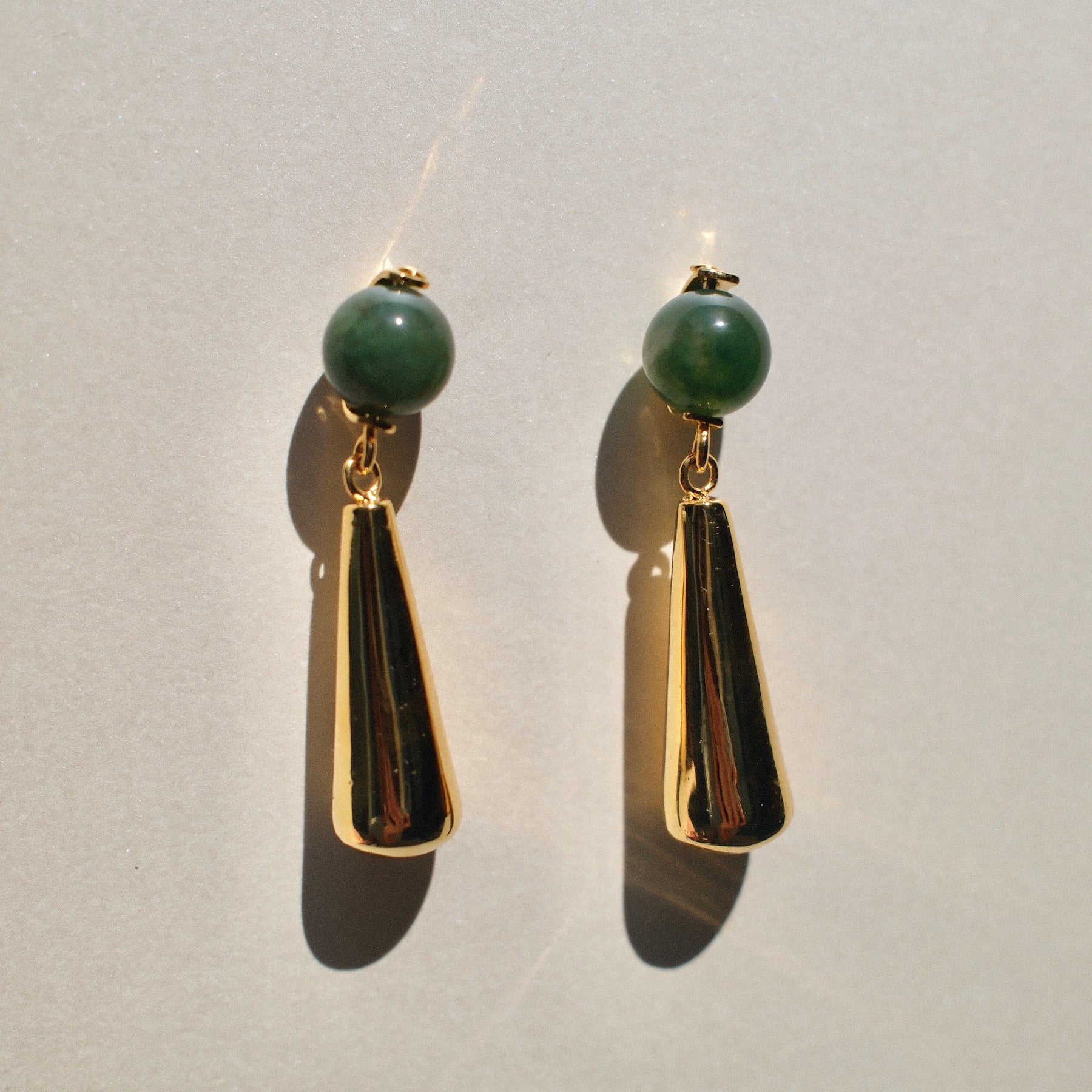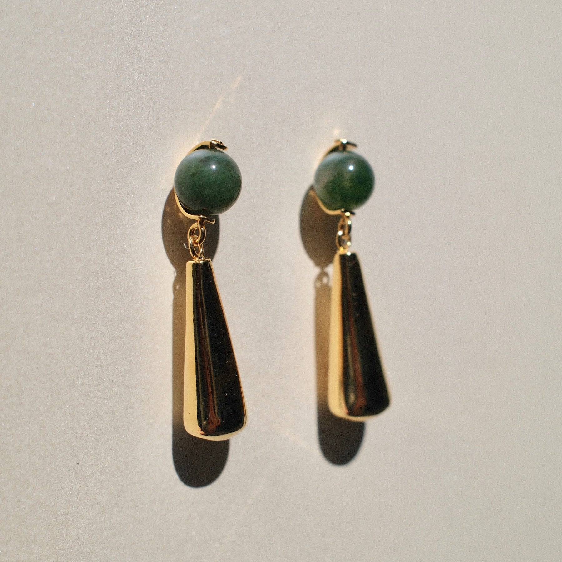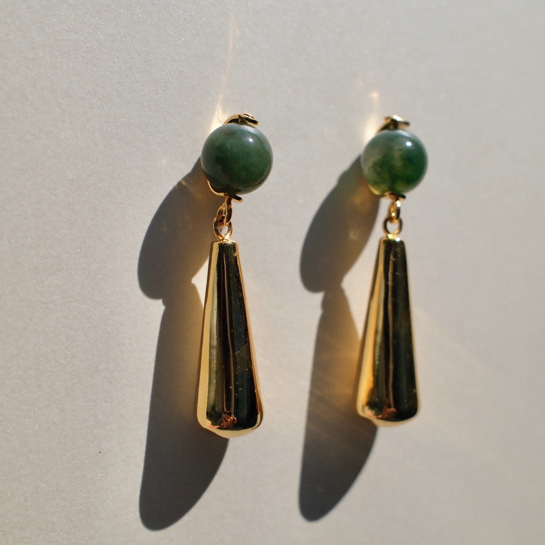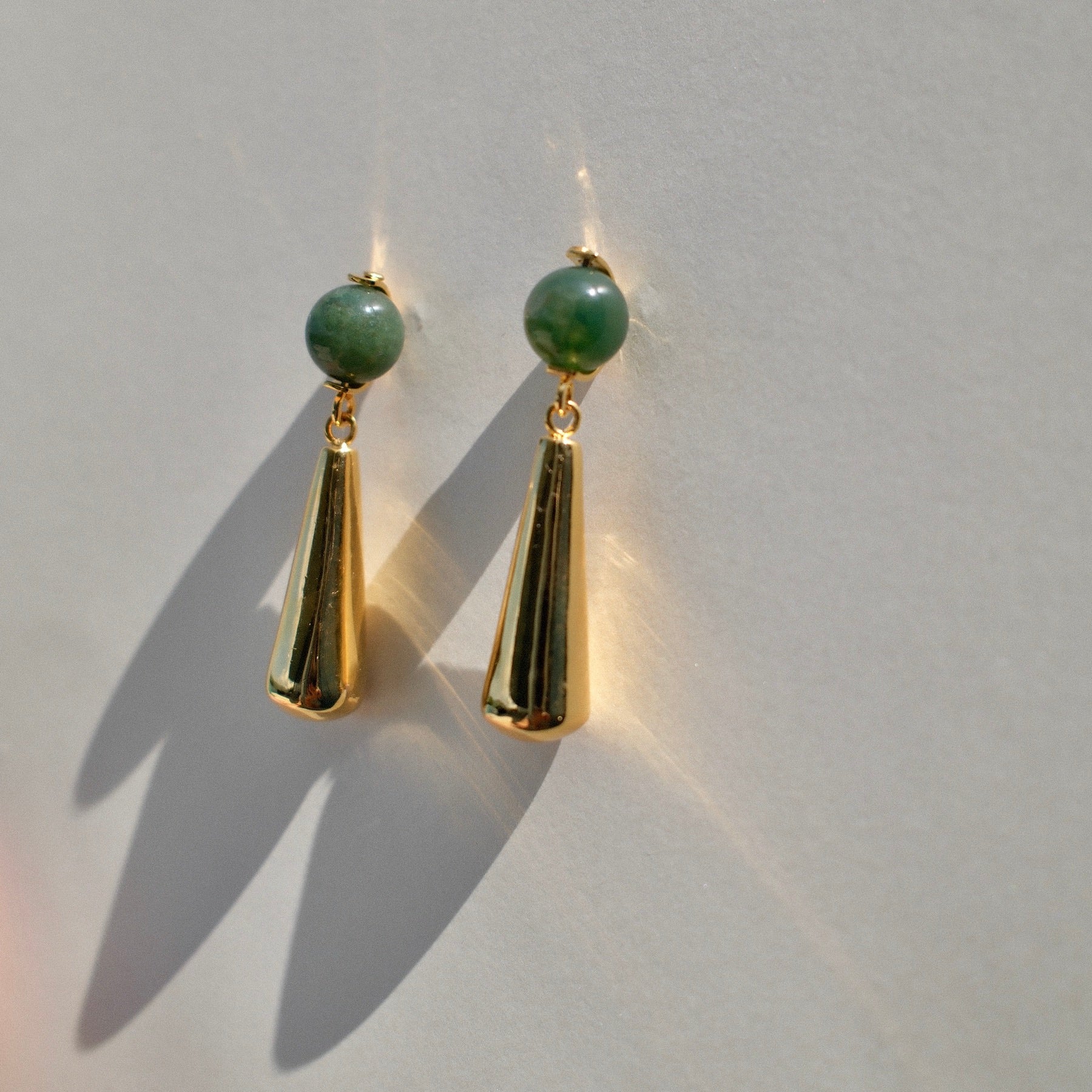 Elegantes y llenos de movimiento, los aretes Vera combinan una piedra natural en la parte superior —disponibles en ágata verde, ojo de tigre, perla o aguamarina— con una delicada gota metálica dorada que cuelga suavemente, reflejando la luz a cada paso.